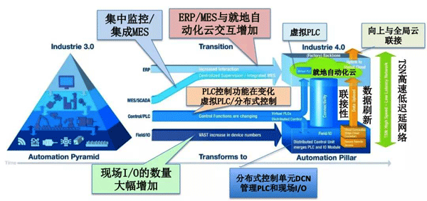 更值得關(guān)注的是PLC的體系架構(gòu)正面臨著顛覆性的創(chuàng)新,下一代的PLC極大可能會(huì)是分布式控制節(jié)點(diǎn)(DCN)取代現(xiàn)場(chǎng)要求實(shí)時(shí)控制的PLC,處在本地云端的虛擬PLC承擔(dān)非實(shí)時(shí)要求或?qū)崟r(shí)性要求不高的PLC功能,依靠強(qiáng)有力的OPC UA over TSN,構(gòu)成開放的分布式的新型PLC系統(tǒng)(詳見(jiàn)附圖)。
