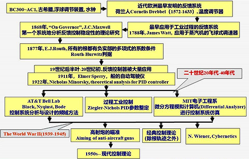 19世紀后半葉-20世紀初, 反饋控制器被大量應用,1911年,Elmer Sperry發明帶有PID控制的船的自動駕駛儀,1922年,Nicholas Minorsky通過分析船的自動駕駛問題,推導出了我們現在稱為的三項控制器-PID(Position-Integral-Derivative)控制器形式。