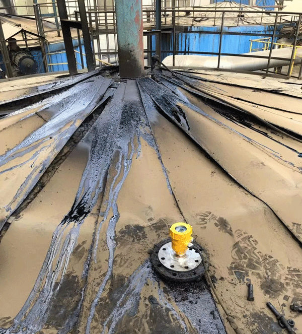 現場儲罐高度為7m,罐內瀝青溫度220℃,罐內有加熱盤盤管,且直徑較小;加熱盤管內有高溫蒸汽,使瀝青一直保持在液態;儀表安裝高度為7.5m,安裝法蘭為DN150。之前客戶選用的是26G喇叭口雷達物位計,由于瀝青的粘附性,即使喇叭口做了防塵罩保護, 喇叭口天線外部及底部天線罩有大量掛料,嚴重影響了雷達信號傳輸。