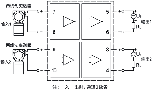 6、輸入側接兩線制4-20mA變送器,輸出側輸出兩線制4-20mA信號