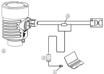 使用軟件調(diào)試時需給雷達儀表提供24VDC,同時在連接HART適配器前端加一個250歐姆的電阻。如果一體式HART電阻(內(nèi)部自帶電阻250歐姆)的供電儀表,就不需要附加外部電阻,這時候HART適配器可以和4-20mA線并聯(lián)。