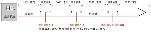 由于感溫部位存在溫度梯度,補償導線上也會產生與該溫度差相當的熱電動勢。熱電偶顯示儀表計算產生的熱電動勢的合計值,并顯示為溫度。