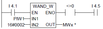 字PIW1包含I1.1的立即狀態(tài)。對PIW1與W#16#0002執(zhí)行AND運(yùn)算。如果PB1中的I1.1(第二位)為真(“1”),則結(jié)果不等于零。如果WAND_W指令的結(jié)果不等于零,觸點(diǎn)A<>0時(shí)將傳遞電壓。