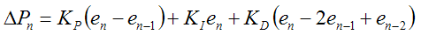 公式中:△Pn為第n次控制器輸出對前次控制器輸出的增量;en為第n次采樣的偏差;KI為積分系數(shù),TS為采樣周期;KD為微分系數(shù)