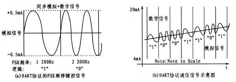 HART協議采用基于Be11202標準的FSK頻移鍵控信號,在低頻的4-20mA模擬信號上疊加幅度為0.5mA的音頻數字信號進行雙向數字通信,數據傳輸率為1.2Mbps。由于FSK信號的平均值為O,不影響傳送給控制系統模擬信號的大小,保證了與現有模擬系統的兼容性。在HART協議通信中主要的變量和控制信息由4-20mA模擬信號傳送,在需要的情況下,另外的測量、過程參數、設備組態、校準、診斷信息通過HART協議訪問。
