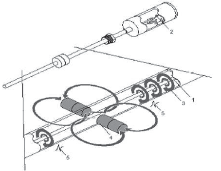 主要是利用磁致伸縮的物理特性進行測量,不受介質的介電常數、溫度或壓力變化的影響。如圖1所示,在非磁性傳感管的內部有一根拉緊的磁致伸縮線1,電路單元沿磁致伸縮線發射電流脈沖2,從而在磁致伸縮線周圍產生一個環形的磁場3,液位浮子內有一組永久磁鋼4,它們本身的磁場使磁致伸縮線沿軸向磁化。當電流磁場和磁鐵磁場疊加,浮子位置的磁致伸縮伸縮線將產生一個瞬時扭力5,同時產生返回脈沖,該脈沖沿磁致伸縮線向兩端傳送,一端傳向傳感管的頂端,另一端傳向傳感管的底部。其中向頂端返回的脈沖波會被變送器電子單元所接收。由于脈沖波的傳播速度是恒定值,電子單元只需通過起始脈沖和返回脈沖的時間差就可以計算出浮子中磁鋼的位置,從而得到精確的液位。