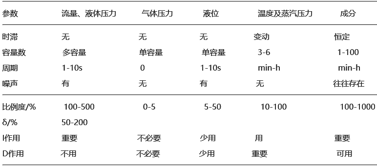 常見控制系統的過程特點及調節器參數范圍
