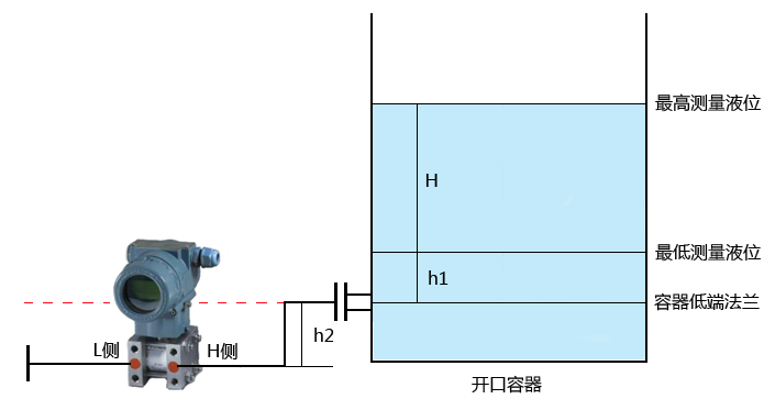 圖4 雙法蘭差壓變送器安裝在開口容器低端法蘭水平線之上(變送器低壓室法蘭高于開口容器低端法蘭水平線上)