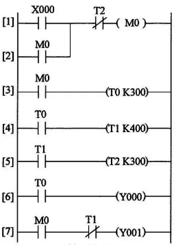 圖6  一種典型的多定時器組合控制的PLC線路與梯形圖