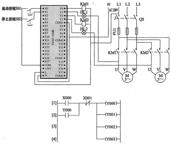 2、正、反轉聯鎖控制的PLC線路與梯形圖