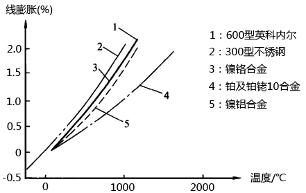 ①熱膨脹系數差異。熱電極材料與保護管之間熱膨脹系數的不同,是造成細鎧裝熱電偶故障原因之一。圖4比較了幾種材料的熱膨脹情況。熱膨脹差異將產生應變,當該種應變產生的應力超過鎳鋁合金屈服強度時,導致熱電極在薄弱點或應力集中處發生斷裂。