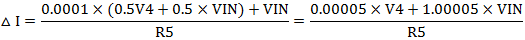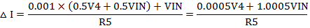 根據(jù)公式(8)可以知道,當(dāng)R1=R2=R3=R4時(shí),輸出電流值I只與R5相關(guān);當(dāng)R5等于采樣電阻時(shí),輸出電流等于輸入電流。且負(fù)載的變化對(duì)電流輸出沒有影響。當(dāng)R1≠R2≠R3≠R4時(shí),電流I與輸出電壓VIN呈非線性關(guān)系。并且當(dāng)負(fù)載變化時(shí),導(dǎo)致V4發(fā)生變化,根據(jù)公式(6)可知,V1會(huì)根據(jù)V4的變化而變化。
