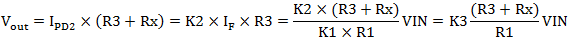 副邊的光敏二極管在發(fā)光二極管的照射下產(chǎn)生一個(gè)微小的電流IPD2,電流通過放大器的反饋電阻輸出電壓Vout。為了保證輸入U(xiǎn)和輸出Uout相等,通過數(shù)字電位計(jì)對(duì)放大器U3的反饋電阻進(jìn)行調(diào)整,數(shù)字電位計(jì)的阻值為Rx。定義 K1=IPD1/IF,K2=IPD2/IF。
