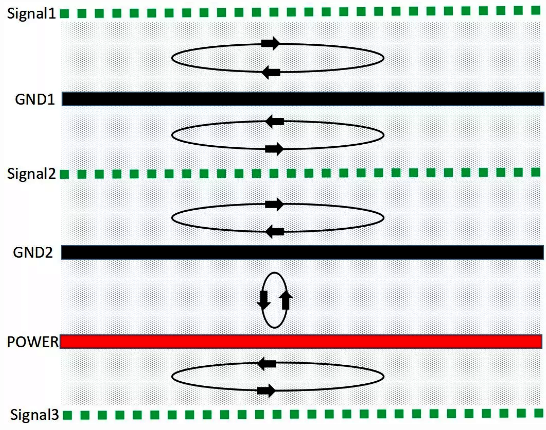 PCB疊層EMC規劃與設計思路的核心就是合理規劃信號回流路徑,盡可能減小信號從單板鏡像層的回流面積,使得磁通對消或最小化。