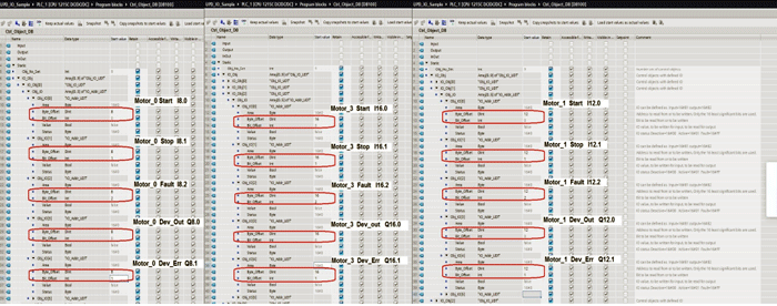 圖15為硬件IO可定義MCC控制功能塊在OB1的調用,我們可以通過變量修改的方式修改DB100中IO_Obj數組變量關聯的硬件IO點,示例中激活了3個控制對象關聯的硬件IO點,分別位于S7-1200不同的IO擴展模塊上,地址定義如圖16-18所示: