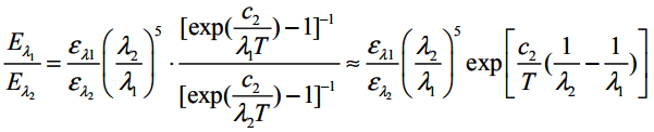 由上式可見,如果波長(zhǎng)λ1和λ2一定,且已知相應(yīng)波長(zhǎng)下的ελ1和ελ2,則兩波長(zhǎng)輻射能量之比與其熱力學(xué)溫度之間成單值對(duì)應(yīng)關(guān)系,只要測(cè)出輻射能量之比就可以求得溫度T。