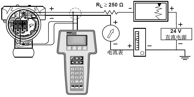 ①按照下圖正確連接3095多變量變送器與HART475手操器,正確連接DC24V電源和3095多變量變送器