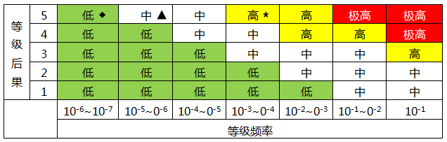 風(fēng)險(xiǎn)評(píng)估矩陣扮演重要角色,是風(fēng)險(xiǎn)評(píng)估和決策的依據(jù)。縱坐標(biāo)是后果嚴(yán)重性等級(jí),橫坐標(biāo)是事件發(fā)生頻率。下一章節(jié)會(huì)展示如何使用這張表格。