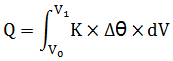 式中:Q為釋放的熱量,J;V為載熱液體流過的體積,m3,V=V1-V2;△θ為熱交換回路中載熱液體入口處和出口處的溫差,℃;K為熱系數(shù),它是載熱液體在相應(yīng)溫度、溫差和壓力下的函數(shù),J/m3℃。
