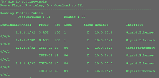 可以看到路由表中已經(jīng)存在1.1.1.3/32和1.1.1.4/32的主機(jī)路由,說明路由引入成功。