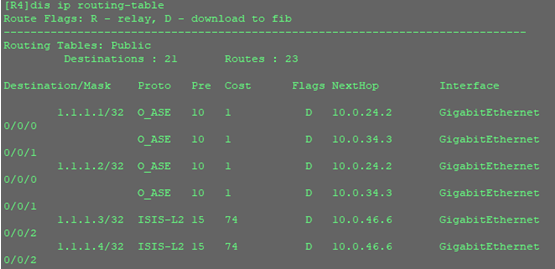 可以看到AR4的路由表中已經(jīng)存在1.1.1.1/32和1.1.1.2/32的主機(jī)路由,說明引入成功。