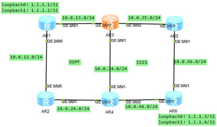 右邊網(wǎng)絡(luò)使用ospf協(xié)議,左邊使用isis協(xié)議,R3和R4連接的鏈路即運(yùn)行ospf,也運(yùn)行isis,實(shí)現(xiàn)在各自網(wǎng)絡(luò)中達(dá)到路由互通。