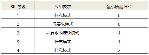 GB/T21109-2017(IEC 61511:2003)11.4條給出了HFT的要求。傳感器、最終元件和非PE邏輯控制器的最小HFT見表1所列,表1規(guī)定了傳感器與最終元件的HFT等級。所要求的HFT等級會隨著SIL等級的提高而增加,并且給出了主導失效模式為安全狀態(tài)或為可檢測出危險失效條件下的要求。
