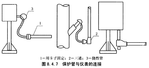 7.3.6 保護管與檢測元件或現場儀表之間,釆撓性管連接時,保護管口應低于儀表進線口約250mm,保護管從上向下敷設至儀表時,在管末端應加排水三通。當保護管與儀表之間不采用撓性管連接時,管末端應帶護線帽(護口)或加工成喇叭口。