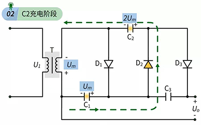 在第二個正半周到來時,變壓器電壓、電容C2電壓、電容C1的電壓進行相互疊加(因為電容C1的電壓方向是反的,所以最后會抵消掉一個Um),使電容C3充滿電,其兩端電壓為2Um,如下圖所示,