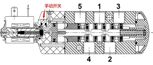 當ASCO 531電磁閥電源故障沒電時,可以通過手動開關控制閥位切換,逆時針旋轉手動開關,鐵芯向左運動,閥芯向右運動,進氣口1與出氣口4相通;