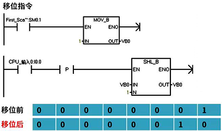如圖2,SHL_B為左移位指令,IN指的是需要移位的操作數,而N則代表移位的個數。程序中VB0的初始值為2進制的00000001,左移一位后最高位丟失,整體左移一位,最低位補0,則變成2進制的00000010。