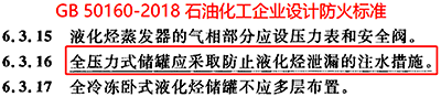 此后,關于全壓力式儲罐應設置注水系統的強制規定,一直被標準延續到今天,甚至將其作為一個重大隱患而提出,可見其備受重視的程度。