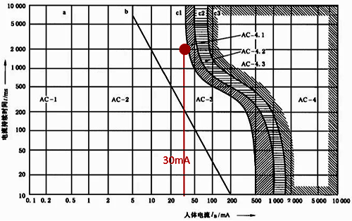 圖1為IEC 60479-1:2018“Effects of current on human beings and livestock-Part 1 :General aspects”,即電流對人和家畜的效應(yīng) 第1部分:通用部分。理論上,AC-1、AC-2、AC-3區(qū)相對安全,但是,該圖是通過人體、動物、尸體試驗得出的,反映的是概率,且以歐美人為主進(jìn)行的試驗,是否完全適合東亞人,不敢斷言(因為我們沒有類似的試驗研究)。因此,采用30mA上限值相對比較安全。