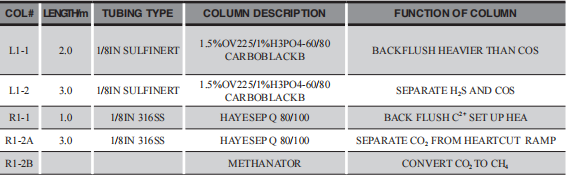 從表1和表2的配置圖中可以看出分離H2S和COS的色譜柱都經(jīng)過鈍化處理(硅鋼管),分離CO2的色譜柱選的是316不銹鋼管,里面根據(jù)需要分離的組份放入不同的填充物(填料)。分離總硫的色譜柱中填充 1.5%OV225(高惰性交聯(lián))和1.0%的磷酸,所以新鄉(xiāng)公司與新疆公司分離總硫的毛細(xì)管色譜柱長度一樣。分離CO2的色譜柱新鄉(xiāng)和新疆公司都是采用的安捷倫色譜柱,新鄉(xiāng)使用的固定相填充物為HAYESEP N型的新疆為HAYESEPQ型,所以長度不一樣,從長度來看新鄉(xiāng)項目的分離效果較好。