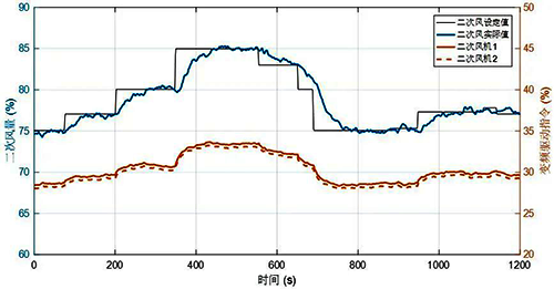 ADRC參數整定公式首先在多個仿真算例進行了驗證,包括延遲對象、非最小相位對象、震蕩環節的對象,甚至是100階的高階對象。之后被用于水箱水位控制的實驗中,最終被應用于實際運行的火電機組中,包括二次風、過熱汽溫等回路。圖3、圖4所示為循環流化床機組二次風回路的應用效果,表中為應用指標對比。實際使用該整定公式非常容易,初次計算的ADRC參數就可以保證投切后系統穩定過渡,無震蕩發散,并且效果比PID的控制效果好很多。