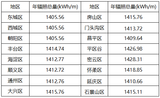 以北京為例進行說明,北京各區(qū)縣水平面年太陽能總輻射量參考值(kWh/m2·a):
