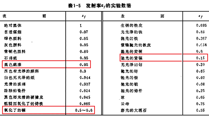 經驗數據表明,黑色磁漆的發散率為0.95,氧化了的銅的發散率為0.5~0.6,拋光的紫銅發散率為0.15,見下表。