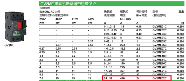回到文章前面,空壓機(jī)額定功率11.2kW±7%,工作電流為23.5A+20%/-10%,即21A~28A。我們選擇過載保護(hù)整定電流范圍為24~32A的GV2ME32C電動(dòng)機(jī)保護(hù)斷路器,保證電動(dòng)機(jī)的額定電流落在斷路器整定電流范圍之內(nèi)。