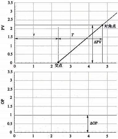 初始點到分割點的時間為等效純滯后時間,分割點到對角點的時間為等效時間常數T。系統等效純滯后時間一般包括真實純滯后時間、反向時間、小時間常數時間等。