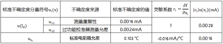 (1)由溫度變送器的輸出電流的測(cè)量重復(fù)性和多功能校準(zhǔn)儀的測(cè)量誤差引起的不確定度分量u(Id)