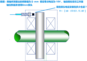 3、保持軸頂在非工作面上,假設3500軸位移通道設置零位電壓為-10V,(使用3300XL 8mm系列電渦流傳感器進行測量)則軸位移傳感器安裝電壓應該是用零位電壓減去剛剛推軸測量出的間隙值所對應的電壓的一半。其計算公式為:傳感器安裝電壓V=-[10-(D/2)×7.87],其中7.87V/mm為8mm電渦流傳感器靈敏度。這樣當軸回到中心點后,軸位移傳感器電壓即應該為-10V。其他不同的零點位置設計可據此類推,改變計算方法即可。