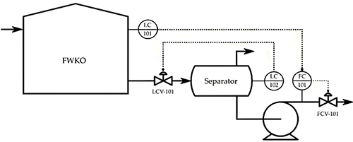 對于FWKO罐,液位為控制變量,出口流量閥LCV-101為操縱變量。對于分離器,由于泵的非線性動力學,采用串級液位(LC-102)輸出流量(FC-101)控制回路來改進液位控制。