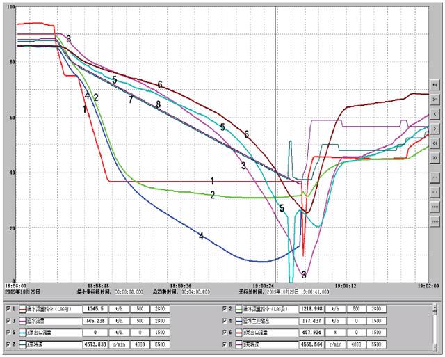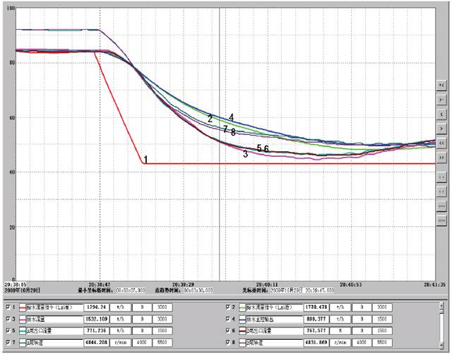 由于實際給水流量已經瞬間減少了一半,協調給水與燃料特性的滯后時間LAG只需要穩定運行泵在最高轉速運行即可,因此,LAG盡可能在大些,否則在給水指令的迅速下降過程中,由于前饋的作用,反而會降低給水泵的轉速。
