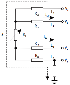 圖3 Rt為熱電阻,RL1為導線L1的等效電阻,RL2為導線L2的等效電阻,RL3導線L3的等效電阻,RL4導線L4的等效電阻