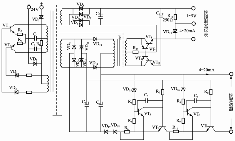 VD10、VD13、VD14全波整流供給的。由于VD13和VD14是在電源正負半波交替工作的,因此將變壓器B2初級線圈的上下兩半分別接入這兩個二極管支路中時,在VD13、VD14的開關作用下,變送器的4-20mA直流信號電流將交替地進入變壓器初級線圈的上下兩部分,使其次級出現方波電壓。這里,變壓器T2工作于電流互感器的工作方式,其次級負載阻抗很小。這樣,在初次級線圈匝數比為1:1的情況下,次級方波電流大小等于初級電流。