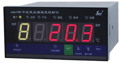 注1:干式變壓器溫度控制器SWP-C80基本型功能三相巡回測量顯示,輸入開路報警顯示并輸出,故障自檢報警顯示并輸出,超溫跳閘顯示并輸出,三相巡回/最大值顯示兩種檢測狀態及指示,風機啟停自動/手動控制狀態的選擇、指示與輸出,三相溫度顯示值獨立數字補償。
