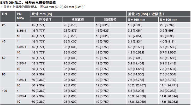 ◆ 作壓力:焊接型溫度計套管THERMOWELL: -0.1~10MPa;整體鉆孔型溫度計套管THERMOWELL: -0.1~30MPa;溫度計套管THERMOWELL隨所選材料種類和使用溫度不同,應(yīng)該將公稱壓力合理地降額后作為使用的工作壓力。