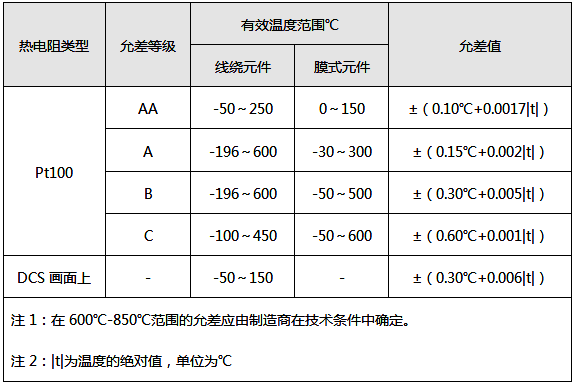 ①在有效溫度范圍內,Pt100的電阻值通過分度表查算出的溫度t與真實溫度的最大偏差,應不超過上表給定的允差值。