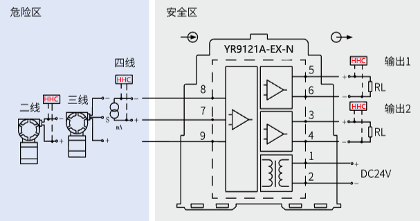 ②一進二出YR9121A-EX檢測端隔離式安全柵接線圖