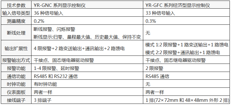 1、YR-GFC系列精度為0.3%FS,是YR-GNC系列0.2%精度顯示控制儀精簡版本